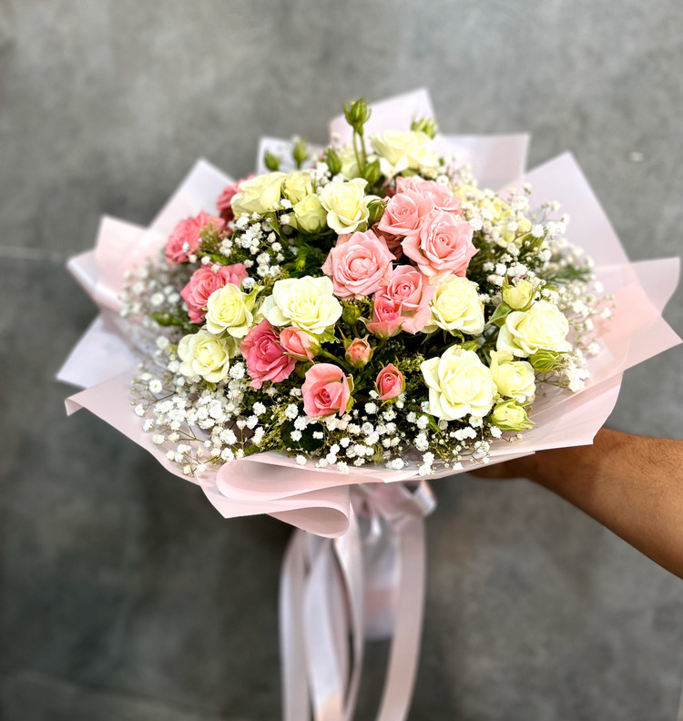 ✔️ دیزاین شده با دو دسته رز مینیاتوری سفید و یک دسته رز مینیاتوری.برگ آرایی .کاغذ ضدآب.ژیپسیفولیا