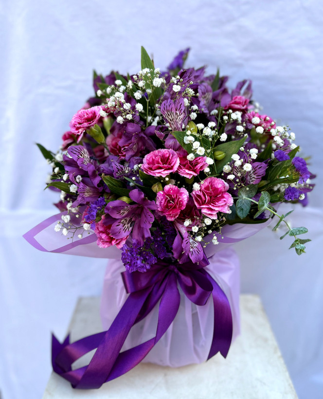 🥀این جار گل که باگل آلستر ومیخک بنفش و زنبوری و عروس دیزاین شده , یکی از زیباترین و پرفروش ترین کارهای مجموعه گل شانار میباشد