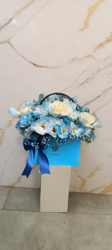 🥀این بگ کیفی که با ۳شاخه گل رز سفید ودو دسته لیسیانتوس آبی رنگ شده وژیپسیفولیا دیزاین شده ,اماده هدیه دادن به عزیزانتان است