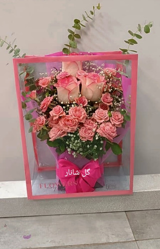 باکس گل طبیعی ۷شاخه رز لب صورتی (کد۳۰۰۰)